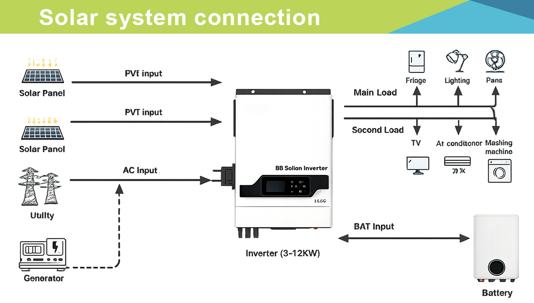 7. Combining solar system, AC utility, and battery power source to supply continuous power