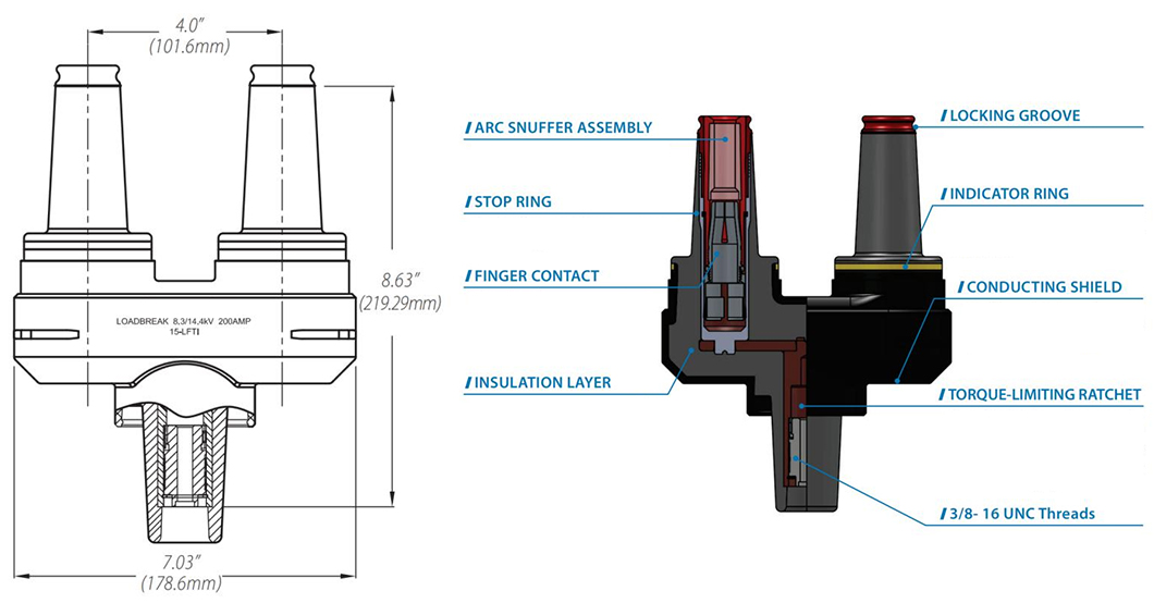 The loadbreak feed-thru insert threads onto a standard 200A bushing well and provides dual loadbreak bushing interfaces.It can convert radial-feed transformers to feed thru transformers and add in-line arrester protection if needed.The torque limit ratchet feature prevents the bushing well stud from breaking during installation. The ratchet feature allows users to rotate the feed thru insert for 360°to orient the feedthru insert in the desired position.The Loadbreak Feed Thru Insert meets all the requirements of IEEE Standard 386, when installed with mating components, the bushing insert provides a fully shielded and fully submersible connection for loadbreak applications.